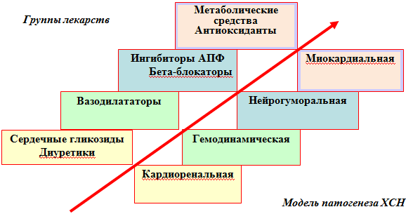 Итак, нарушения в сердце при старении и ХСН проявляются не только структур-ным, но и метаболическим ремоделированием. Поскольку разработка стратегии лечения ХСН всегда имеет в виду патогенетическую концепцию заболевания (рис. 1), то зададимся вопросом о том, насколько существующие лекарства, из числа сегодня назначаемых больным с ХСН, могут корректировать эти изменения.