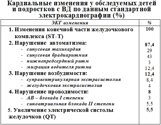 В исследование было включено 72 человека с ВД, из них 49 детей в возрасте от 8 до 13 лет и 23 подростка в возрасте от 14 до 16 лет. ВД протекала по симпатикотоническому варианту - у 25-ти, по ваготоническому - у 20-ти, по смешанному - у 27-ми пациентов. Критериями отбора детей и подростков являлись стойкие нарушения процесса реполяризации в миокарде либо его сочетание с другими электрокардиографическими изменениями по данным стандартной ЭКГ.