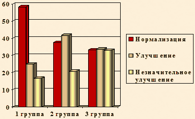 Рис.1 Динамика ST-T нарушений по данным стандартной ЭКГ после курса лечения у 3-х групп детей и подростков.
