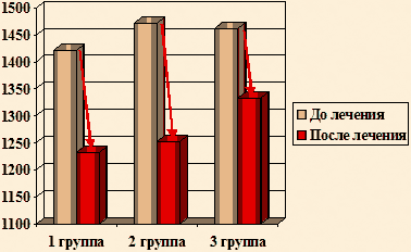Эффективность энерготропной терапии нашла отражение в результатах исследования ЭКГ после лечения в 3-х группах наблюдения. При этом анализ динамики нарушений конечной части желудочкового комплекса (снижение, изоэлектричность, инверсия зубца Т) показал, что положительный эффект в виде нормализации процесса реполяризации наблюдался в первой группе -у 58%, во второй группе – у 37,5%, в третьей группе – у 33,3% обследуемых.