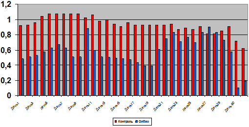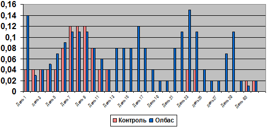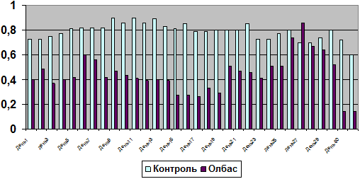 Таким образом, на фоне ингаляций препарата Олбас в течение первых 20 дней отмечается менее выраженное проявление симптомов «заложенность носа» и «слизистые выделения из носа», бальная оценка которых приведена на графиках 1-2, по сравнению с контрольной группой. Эти данные отражают то, что в данный период дети основной группы болели реже или не так тяжело, чем дети контрольной группы.
