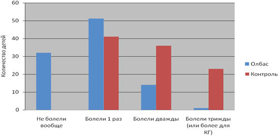 В то время как в контрольной группе не заболевших детей не было вообще, 41 ребенок заболел один раз, дважды болели 36 детей и три и более раз болели 23 ребенка. Таким образом, общее число заболевших детей в основной группе меньше на 32%, чем в контрольной группе.