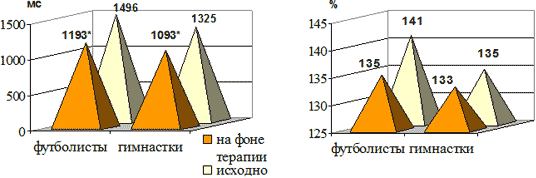 При динамической оценке данных ХМ в процессе лечения Кудесаном форте не зафиксировано статистически значимых изменений ЧСС, но благоприятное влияние препарата на вегетативную регуляцию ритма сердца привело к улучшению его циркадной структуры - уменьшению ЦИ и приближению его к аналогичному показателю здоровых детей (рисунок 1). Кроме того, на фоне терапии отмечалось сокращение продолжительности асистолии на 20,3% от исходного уровня у футболистов и на 17,5% - у гимнасток (p<0,05), а частота регистрации пауз ритма длительностью более 2 секунд снизилась в 2,5 раза. После курса лечения отмечалось также исчезновение эпизодов ишемии миокарда и эктопических аритмий, наблюдаемых исходно у 20% атлетов.