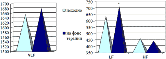 Примечание: * - отличия от соответствующих исходных показателей статистически значимы при p<0,05. VLF – спектр очень медленных волн, LF - спектр медленных волн, HF - спектр быстрых (вагусных) волн.