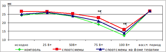 Рис.3. Динамика показателей процессов реполяризации (dQTc) у юных атлетов в ходе пробы с дозированной физической нагрузкой на фоне терапии.