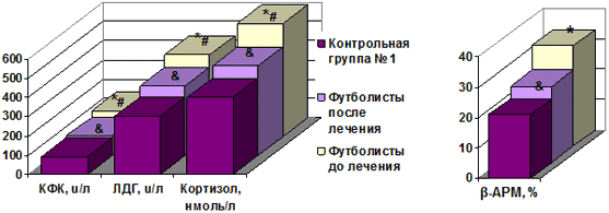 В процессе терапии у юных футболистов зарегистрировано снижение уровней кортизола, КФК и ЛДГ, исходно превосходящих таковые для детей контрольной группы на 40-200% и отражающих повреждение мышц в ходе интенсивных нагрузок. А уровни тропонина I, являющегося наиболее чувствительным маркером повреждения миокарда (Жданова О.И. и др. 2006; Rifai N et al., 1999), на фоне приема Кудесана форте снижались у спортсменов обеих групп: с 0,52+0,073 до 0,29+0,092 нг/мл (p<0,001) у футболистов и с 0,34+0,069 до 0,16+0,016 нг/мл (p<0,05) у гимнасток (и не отличались от значений детей контрольных групп), что в сочетанием со уменьшением реактивности β-АРМ (таблица 4) подтверждает кардио- и стресспротекторные свойства Кудесана форте и согласуется с данными других авторов (Лакомкин В.Л. и др., 2004).