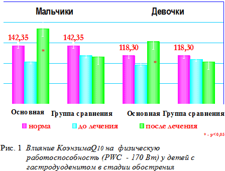 Выраженность клинической симптоматики полностью исчезла на фоне терапии у детей основной группы, а в сравнительной группе уменьшилась. Это касалось ранних болей в эпигастральной области (сразу после еды), «тощаковых» болей, наблюдавшихся у 82% обследуемых, диспептических расстройств (отрыжка, изжога, тошнота). В основной группе значительно повысилась физическая и умственная работоспособность. Результаты исследования физической работоспособности до и после лечения Кудесаном отражены на рисунке 1.