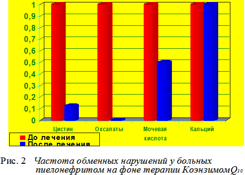 При оценке влияния Кудесана на экскрецию с мочой отдельных метаболитов оксалатов, мочевой кислоты, цистина) отмечено отчетливое снижение частоты обменных нарушений у больных с пиелонефритом (рисунок 2).