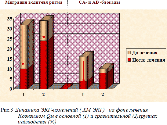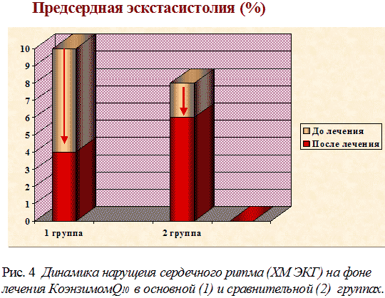 Из приведенных данных следует, что применение КоэнзимаQ10 эффективно не только при изменениях процесса реполяризации в миокарде, но и при нарушениях сердечного ритма и проводимости.