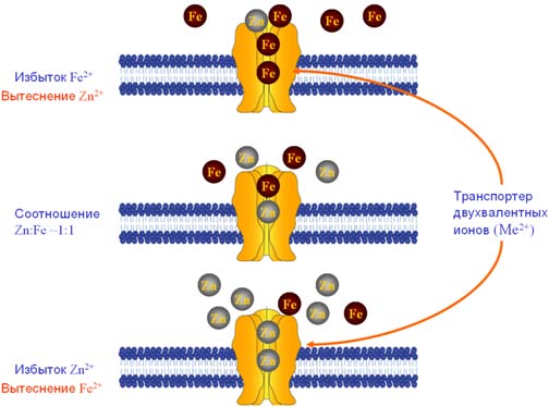 Сформулированная выше гипотеза о возникновении антагонизма между цинком и железом как следствие конкуренции за транспортные рецепторы подтверждается приведенными выше результатами экспериментальных и клинических исследований (исследования [3-5,20-23] и др.). Эти исследования показали, что только при высоких молярных соотношениях наблюдаются эффекты взаимодействия. Если бы взаимодействие было опосредованно через изменения уровней транскрипции, оно было бы уже заметным при молярных соотношениях порядка 1:1.