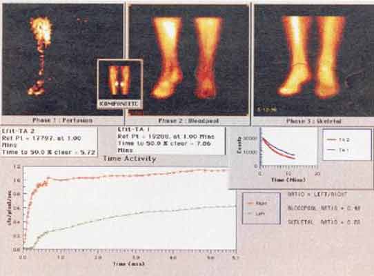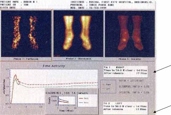 3) нарушение накопления Те99 в левой стопе со снижением на 40% по сравнению с правой стопой;
