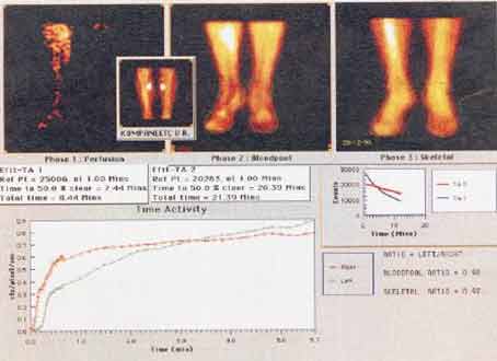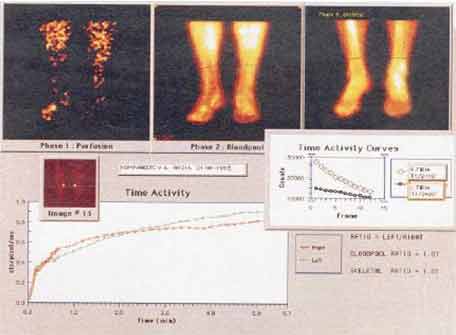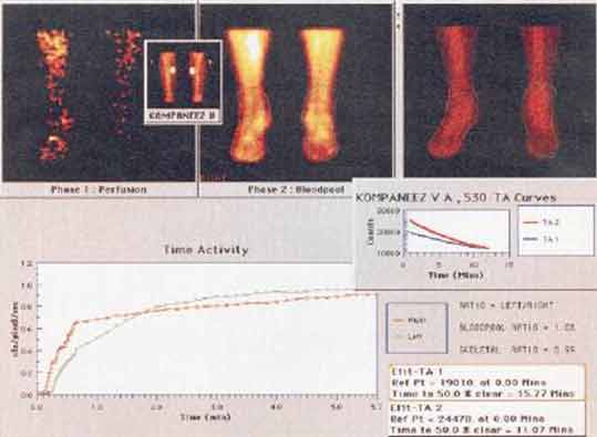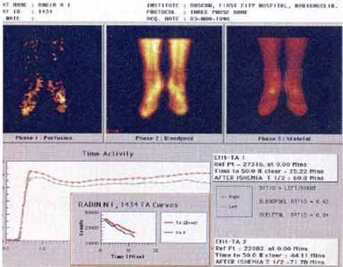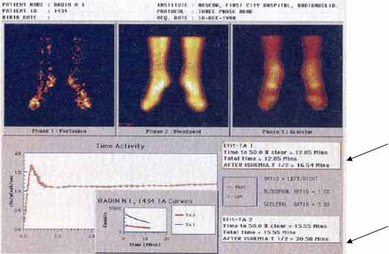 На представленной сцинтиграмме от 03.11.1998 г. (рис. 5) видим что при сохранении маги-стрального кровотока имеются значительные нарушения кровообращения на уровне микроцирку-ляции в обеих нижних конечностях.