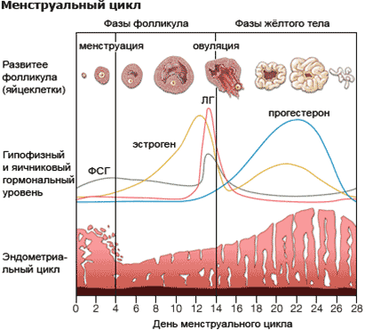 Ниже на рисунке представлен менструальный цикл, развитие яйцеклетки, изменения в эндометрии и изменение гормонального фона (по 4 гормонам) у здоровой женщины.