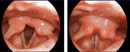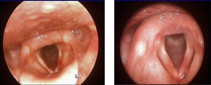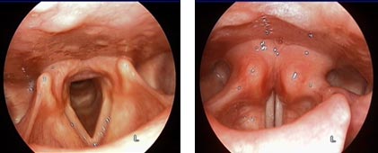 На рис.1 хорошо видны узелки голосовых складок на вдохе. Рис.2 - узелки голосовых складок препятствуют полному замыканию голосовых складок во время фонации, суживая диапазон.